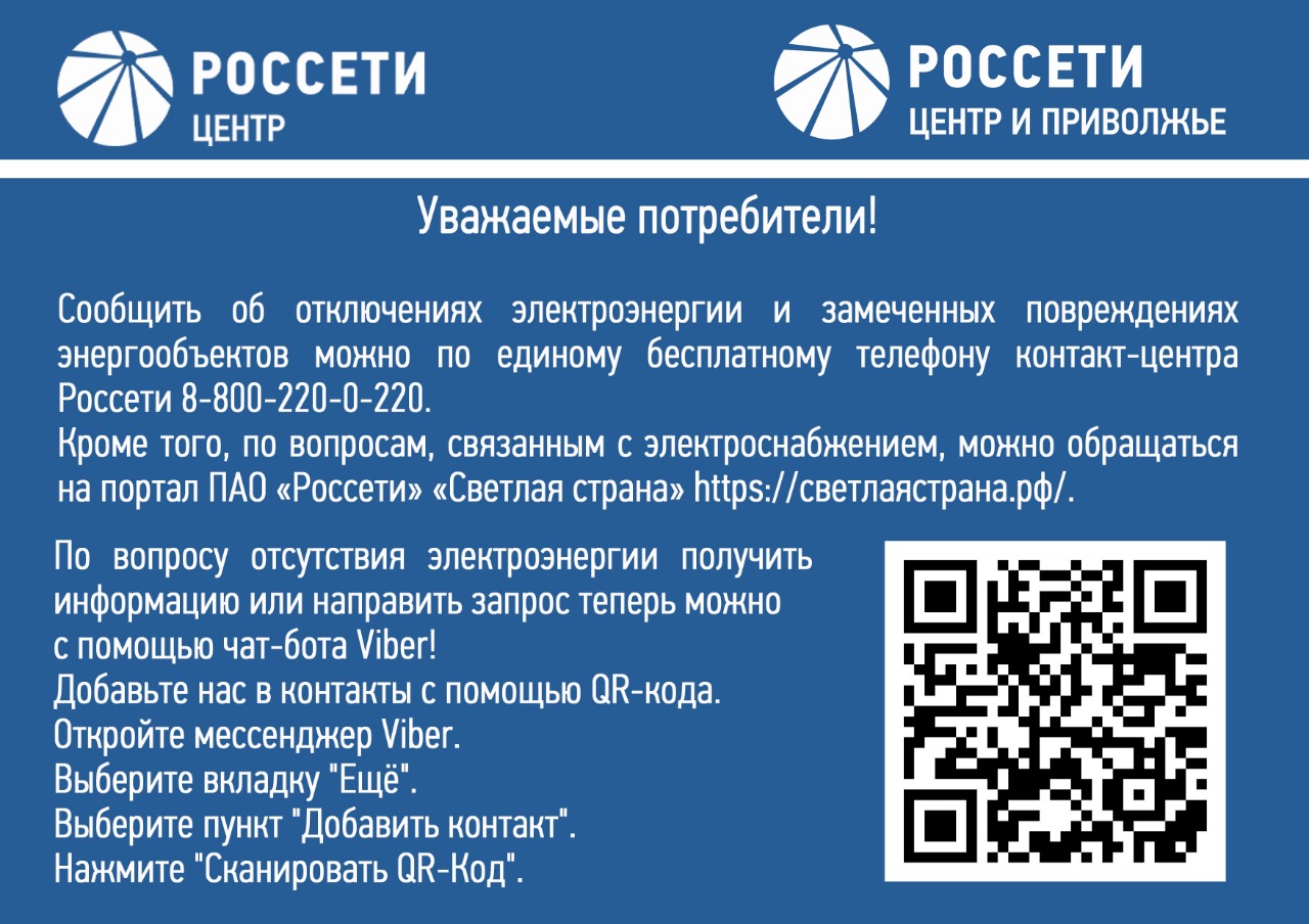Сообщить об отключениях электроэнергии и замеченных повреждениях энергообъектов можно по единому бесплатному телефону контакт-центра Россети 8-800-220-0-220.